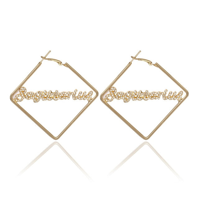 Letter Loop Earrings: Geometric Square Crystal Hoop Earrings