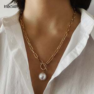 IngeSight.Z Punk Imitation Baroque Pearl Pendant Necklace Curb Cuban Thick Chain Toggle Clasp Long Necklaces for Women Jewelry